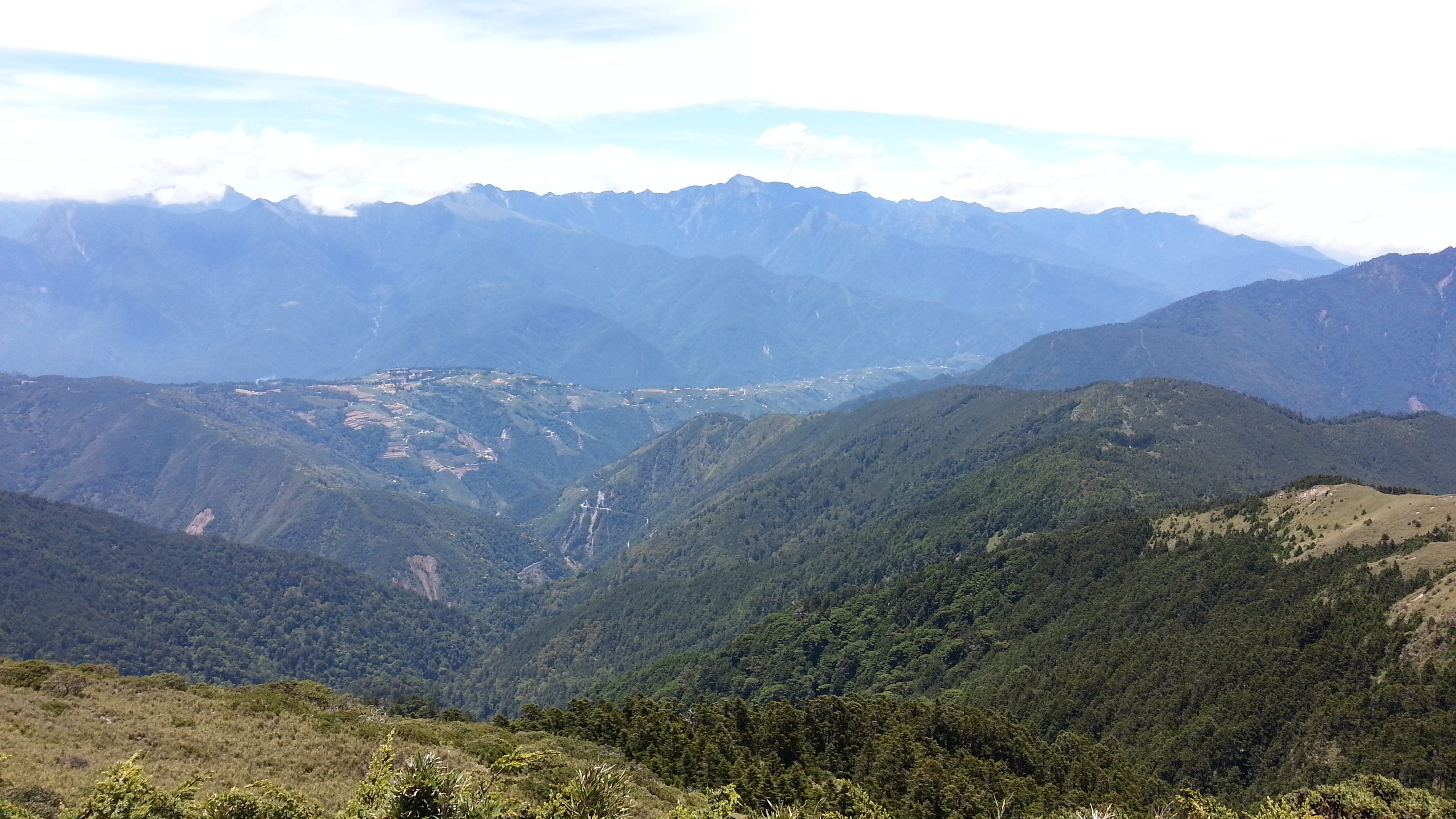 ▲望向東南方,在畫面最高點,中間偏右處,是大家非常熟悉的奇萊北峰,往右稍低一點點的,才是奇萊主峰。奇萊北峰標高3607公尺,一等三角點,奇萊主峰標高3560公尺,三等三角點。跟合歡群峰一樣,北峰比主峰還要高。畫面最遠方是奇萊東稜,百岳裡,大家比較不熟悉的磐石山跟立霧主山。