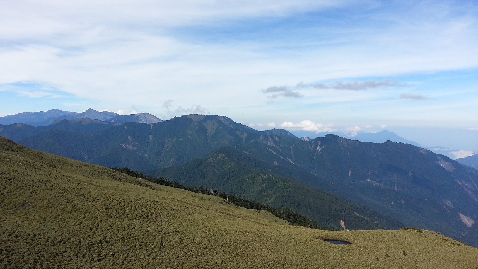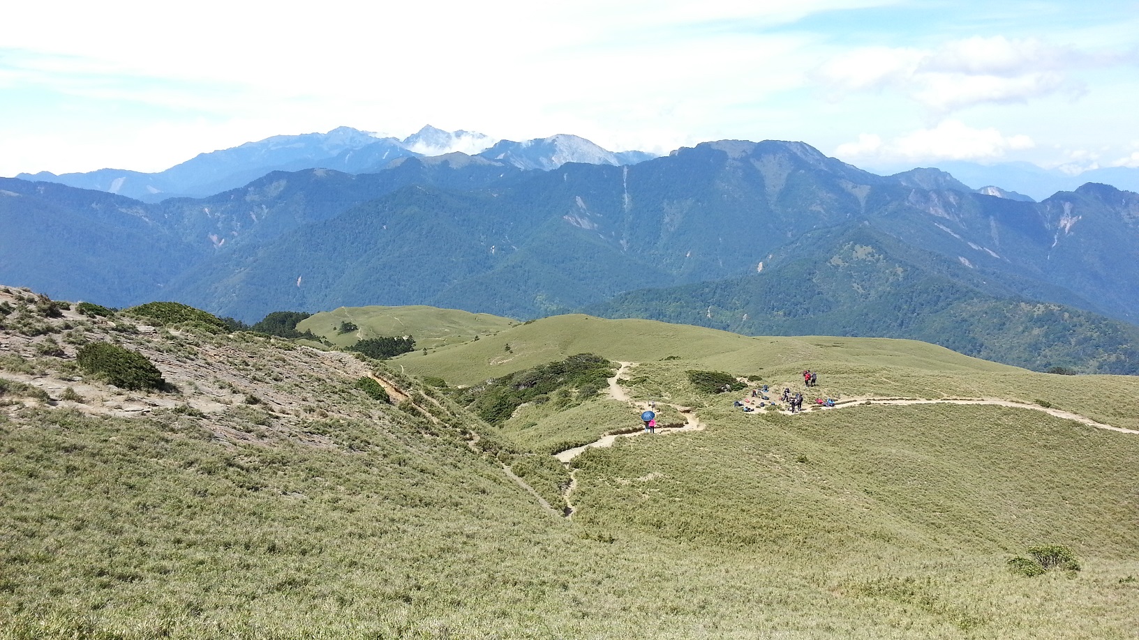 ▲往西邊望去,想當然爾,就該是合歡西峰。西峰是在這稜脈的盡頭,位於畫面中央,有著美麗大草原的渾圓山頭的後方,非常不明顯。如果是這樣的天氣走合歡西峰,可才會叫人心曠神怡。