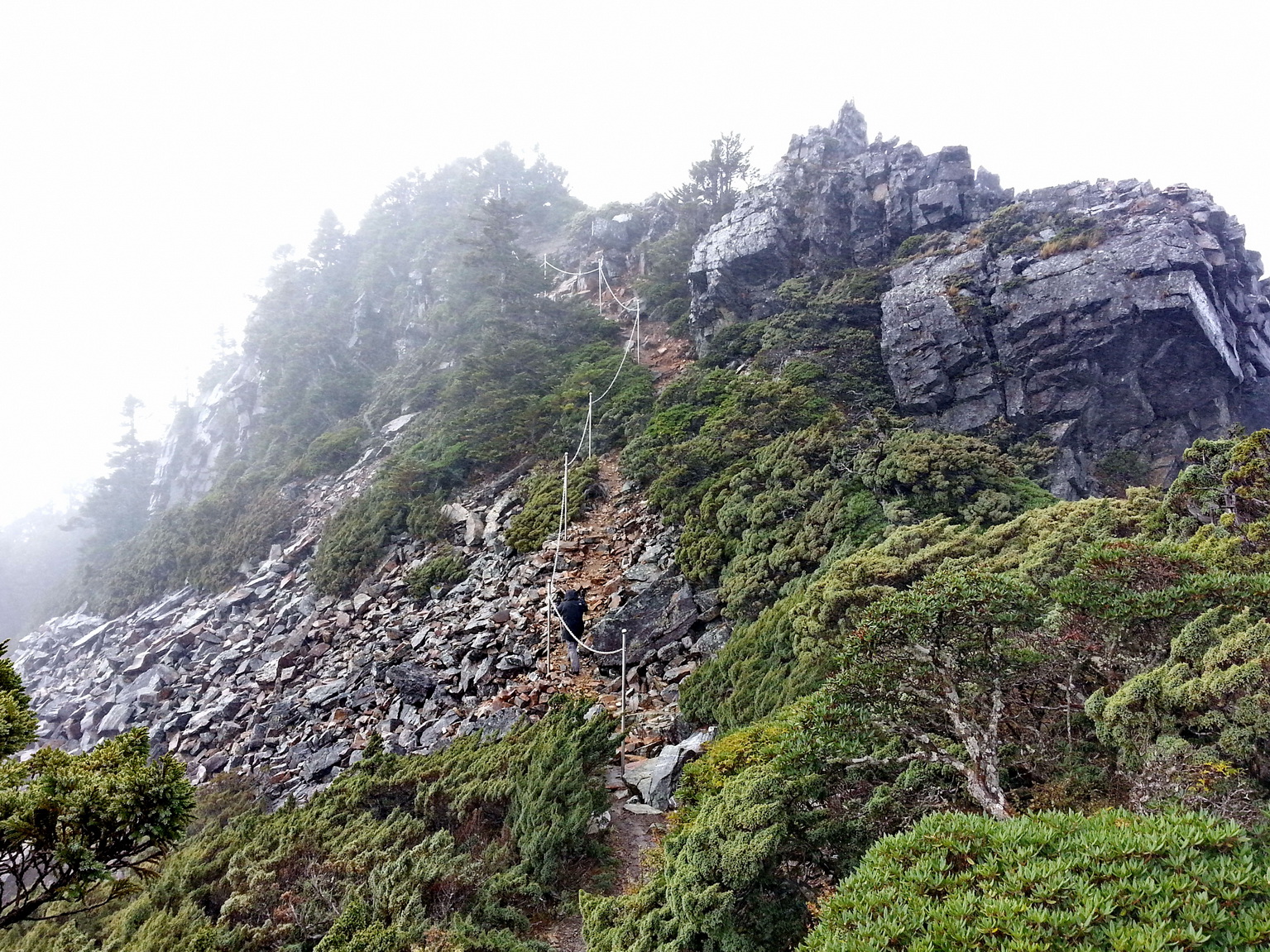走出排雲,霧雨迎面飄過來,能見度不到50公尺,還好今天的行程是主峰跟北峰,受雨影響不大,但也不好走就是了。著好裝後,我們往主峰步道出發,走還沒幾百公尺,我們便開始不斷超越,不知是體能不夠,還是裝備不足,在低溫濃霧細雨中,行進速度頗漫的商業團隊。抵達主北岔路時,我們兩人已經走到人龍的很前面。