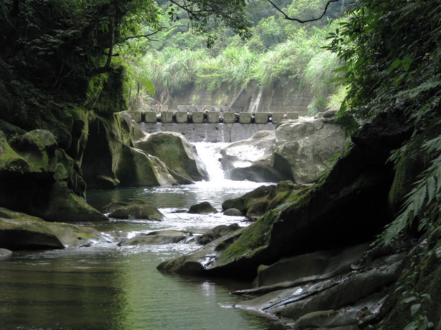 峽谷潭上溯約一百公尺,有個高兩公尺左右的小瀑布,瀑布上方是一道攔砂壩,下方是四十坪大小的清潭。我曾在這個潭見到一群十幾二十公分長的苦花飛躍瀑布而上,此起彼落,像影片裡的鮭魚群那般。